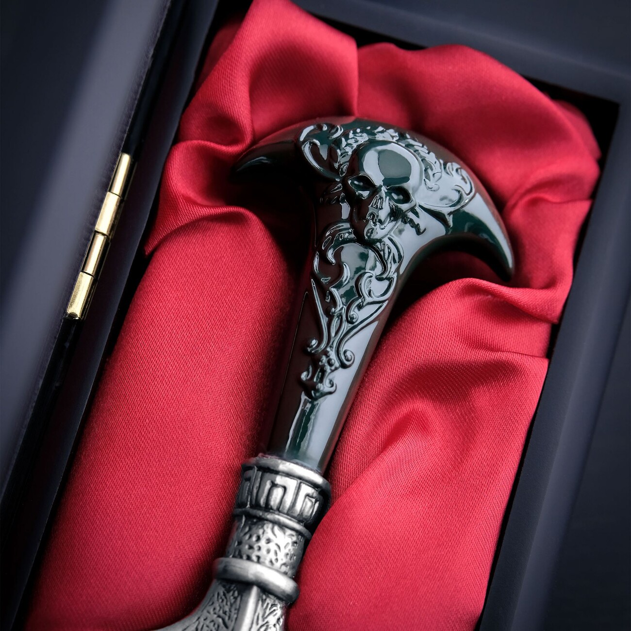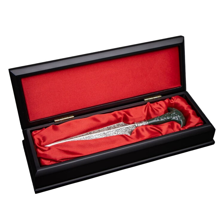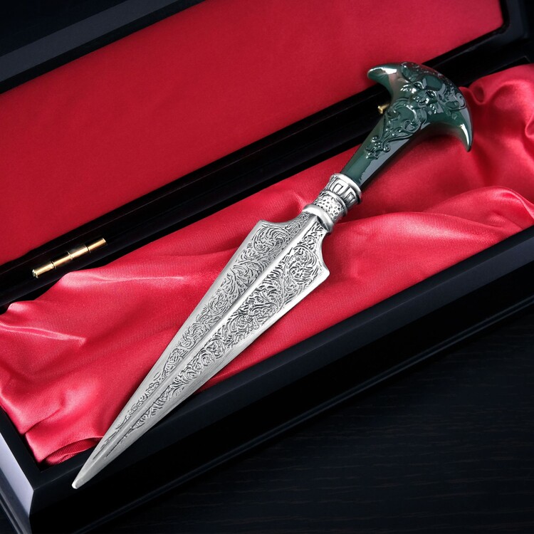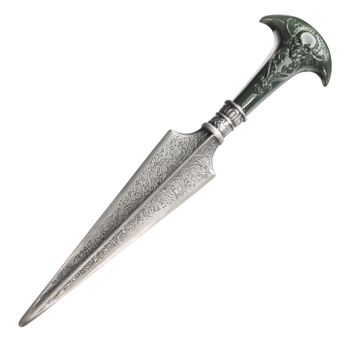 The luxurious replica of Bellatrix Lestrange's dagger from Harry Potter and the Deathly Hallows is precisely crafted from die-cast metal and richly decorated with ornaments. It is bladeless, has a dark green handle with a skull and has an overall length of 19 cm.