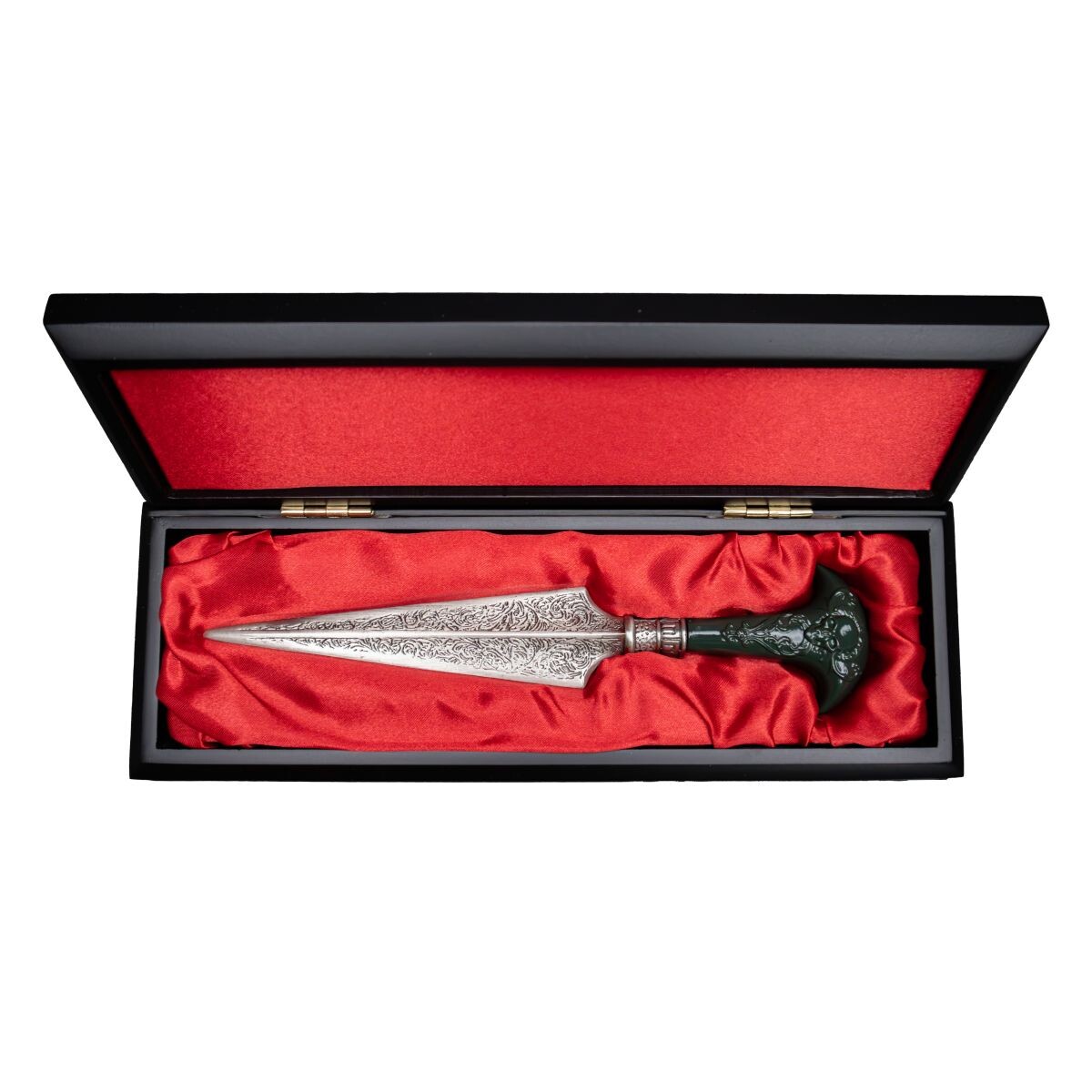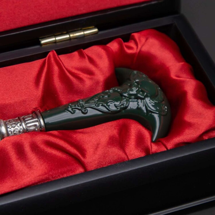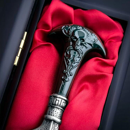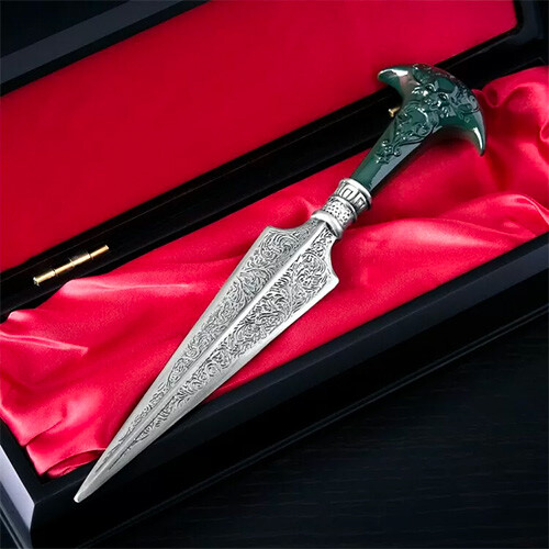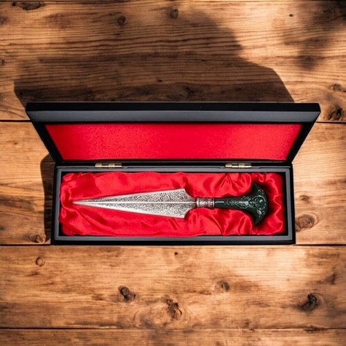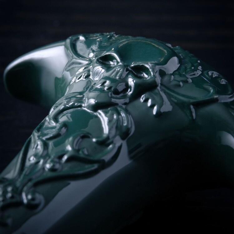 The luxurious replica of Bellatrix Lestrange's dagger from Harry Potter and the Deathly Hallows is precisely crafted from die-cast metal and richly decorated with ornaments. It is bladeless, has a dark green handle with a skull and has an overall length of 19 cm.