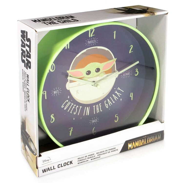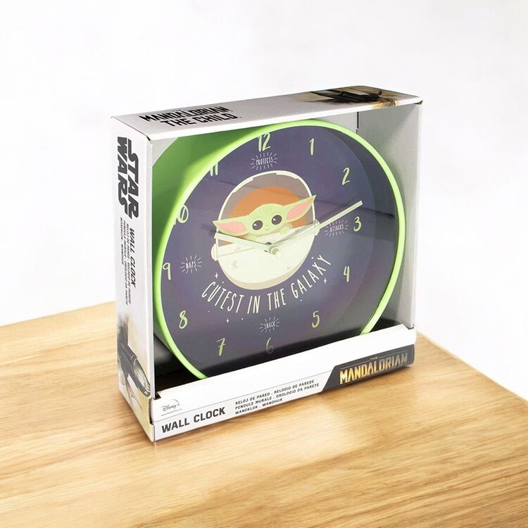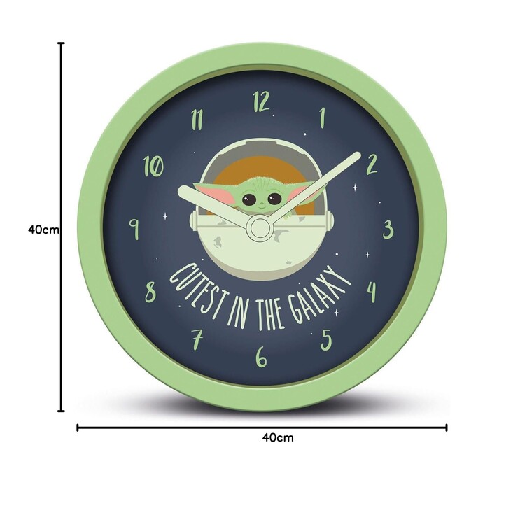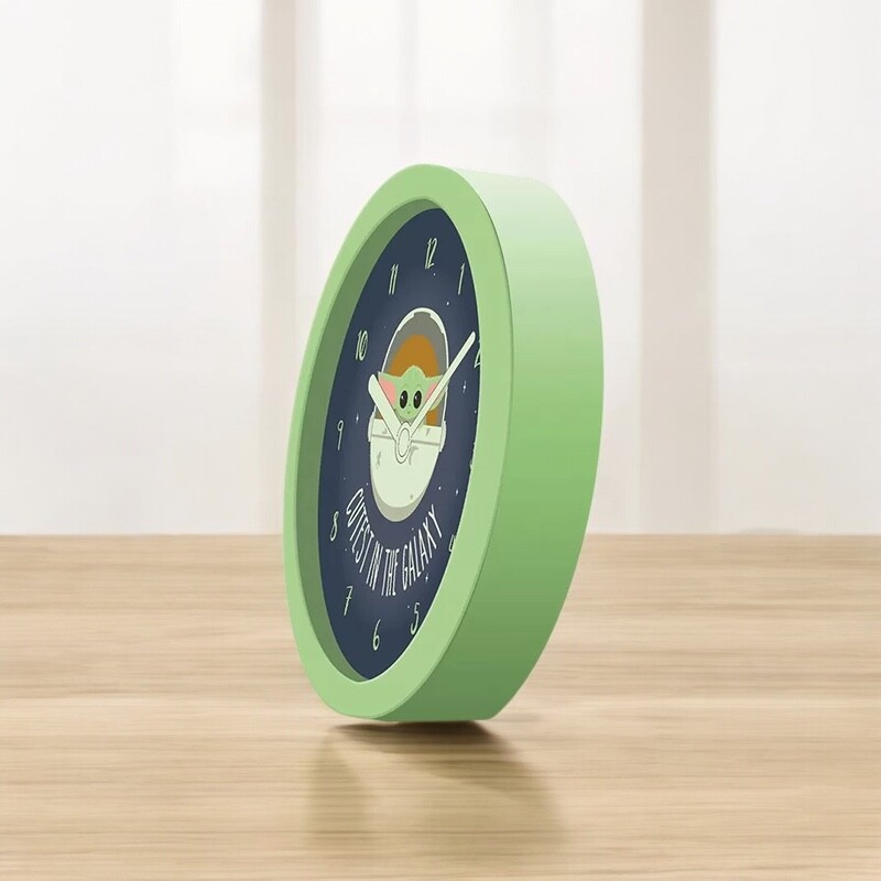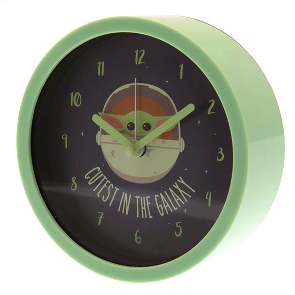 Cute alarm clock with Baby Yoda motif, 12,5 cm in diameter, with silent operation and bluetooth function.