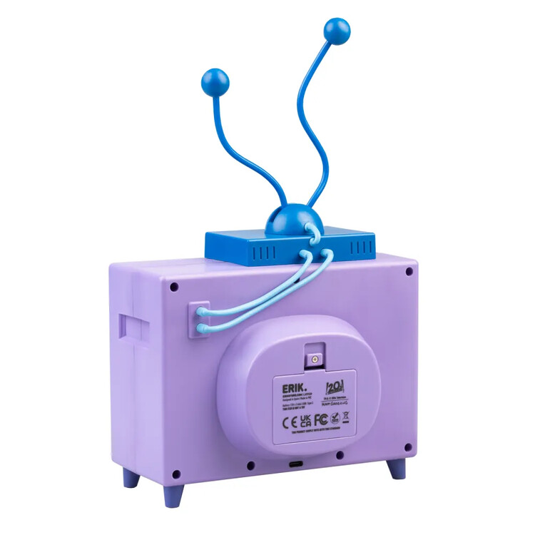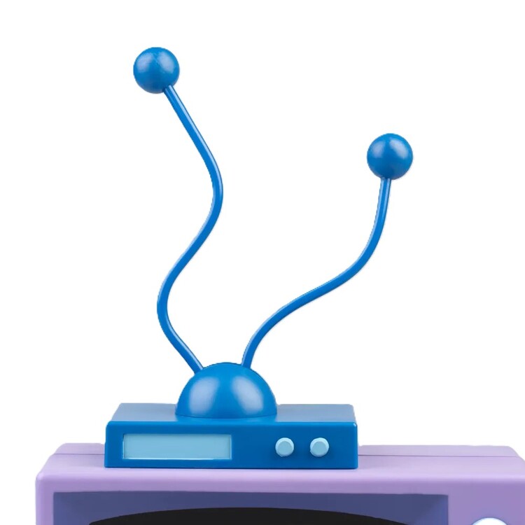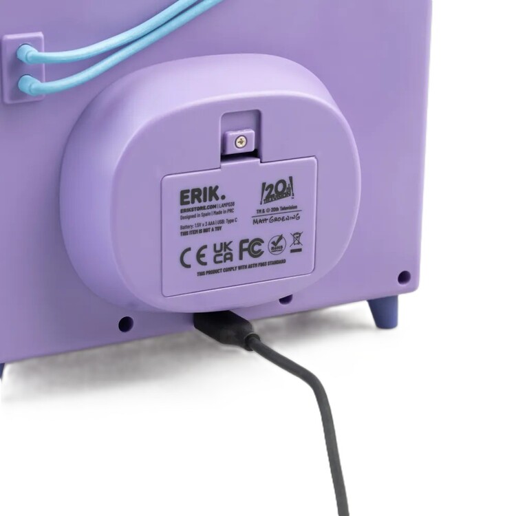 Desk lamp shaped like a retro TV from The Simpsons adds playful nostalgia to any space. The cool-tone LED is controlled via a front button, with brightness adjusted by the dial beneath it. Bendable antennas let you style the look. Power: removable USB-C cable (included) or 3× AAA batteries (not included). Material: PVC, ABS.