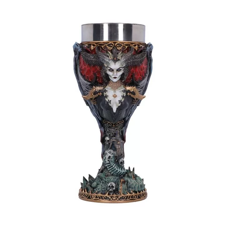 Pledge yourself to darkness with this officially licensed Diablo® IV goblet. Featuring Lilith, Daughter of Hatred, who can be seen emerging from the front of the goblet with her wings protruding behind her and wrapping around the back, creating a striking 3D effect. Whilst the stem of the goblet is inspired by Hell’s Gate and the demons which lie within. Cast in the highest quality resin, this Diablo® IV goblet is the perfect addition to any gaming and pop-culture collection.