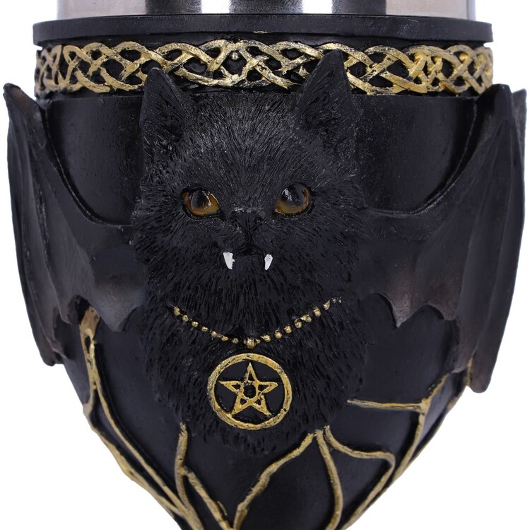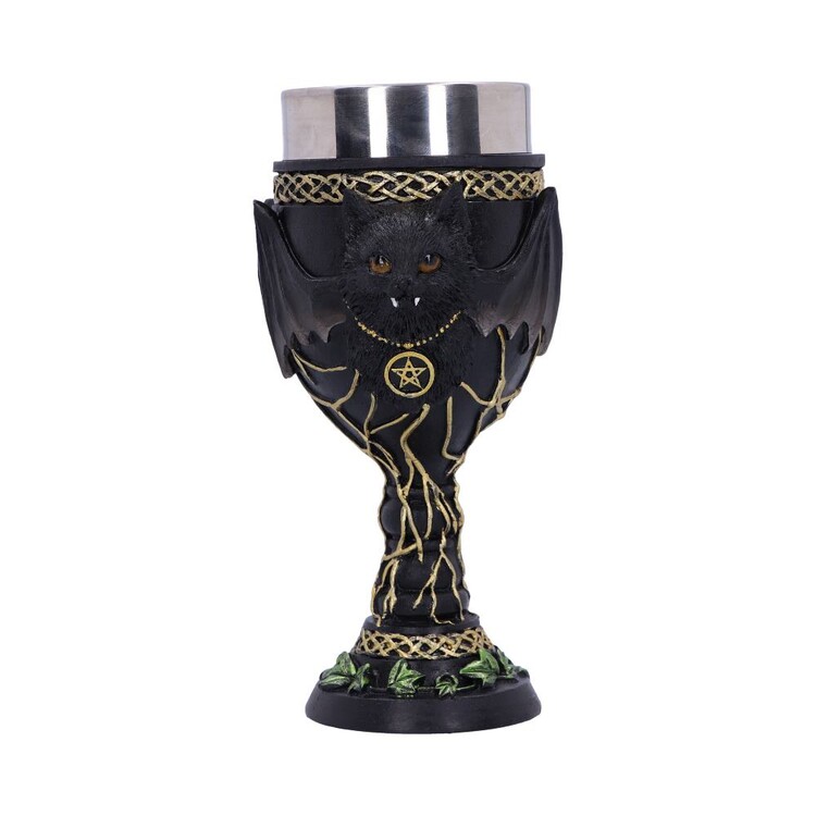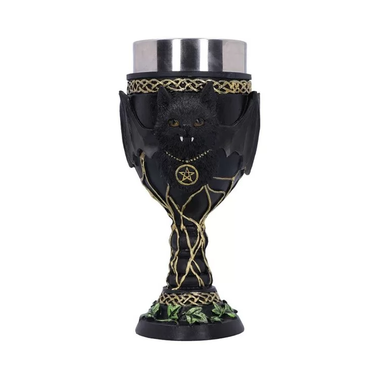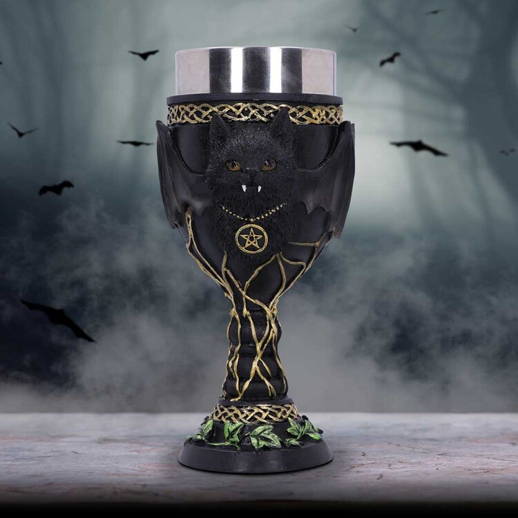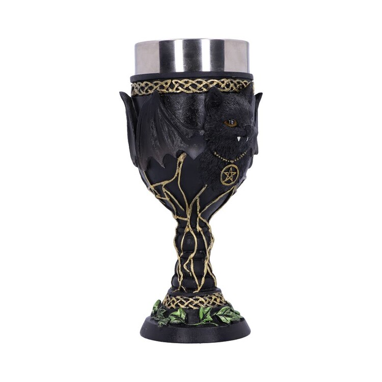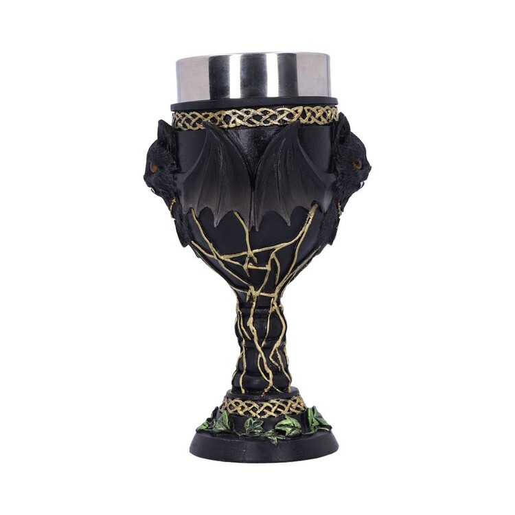 In the centre of the Goblet sits Feline Fang, spooky but adorable they have two white fangs hanging from their mouth and wide bat wings that cover the Goblet. Around the top and bottom of the Goblet are gold knot detailings as well as green ivy which sits at the very base. Cast in the finest resin before being expertly hand-painted, this Goblet is perfect for any lover of all things gothic and spooky.