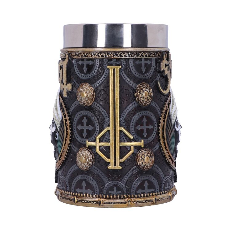 Official Ghost tankard, hand-painted, with gold accents and a removable stainless-steel insert for easy cleaning; suitable for hot and cold drinks.