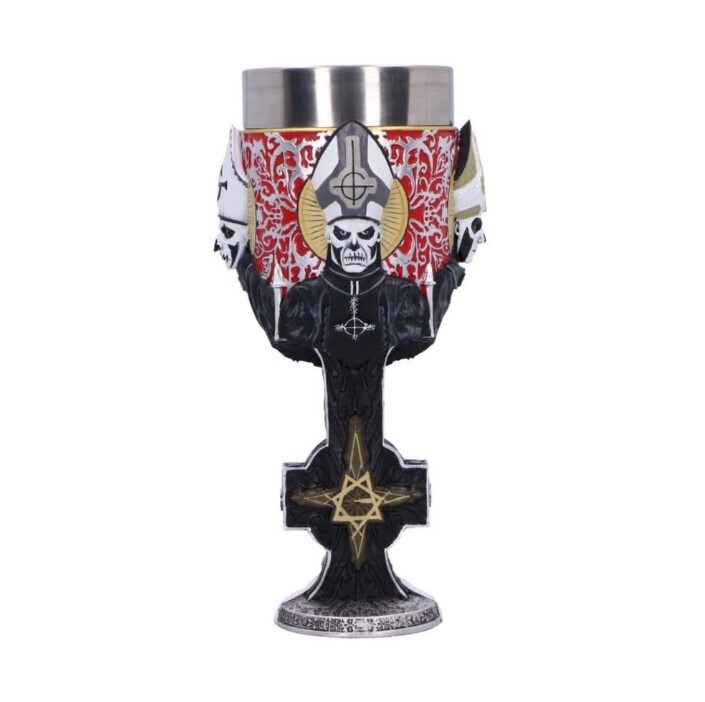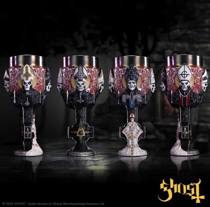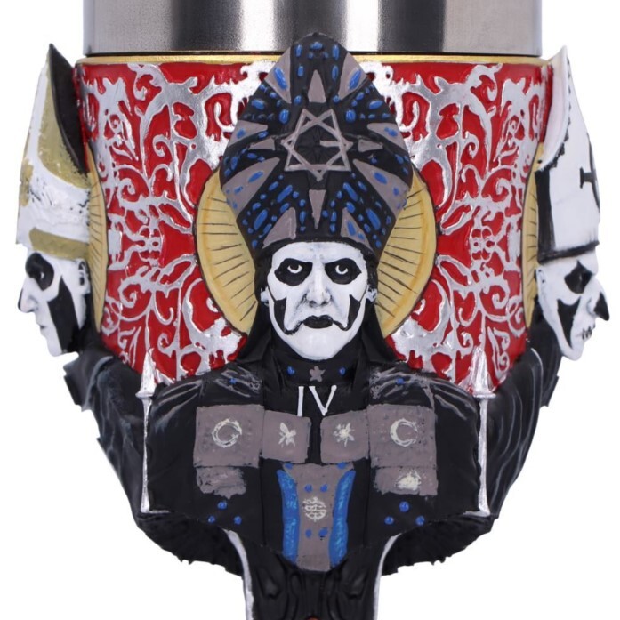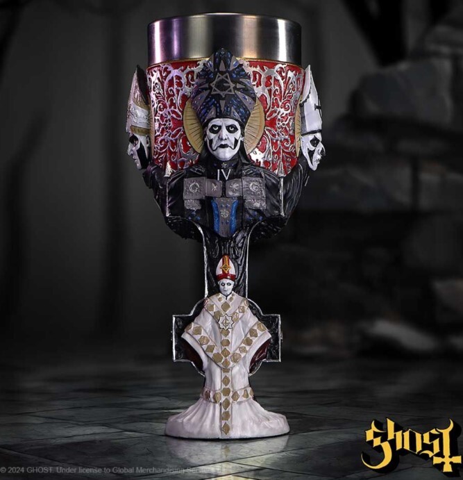 Official Ghost goblet, hand-painted, with a wraparound depiction of Papa Emeritus’ evolution and a removable stainless-steel insert; suitable for hot and cold drinks.