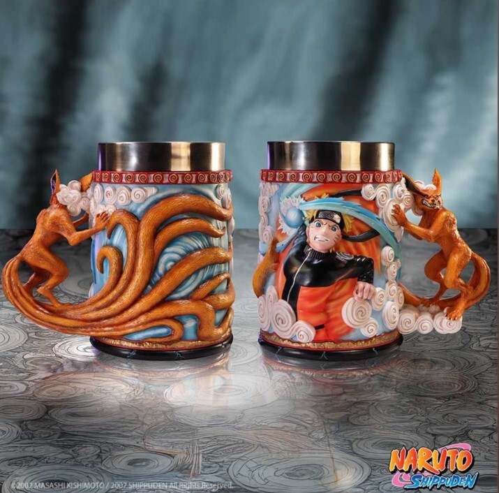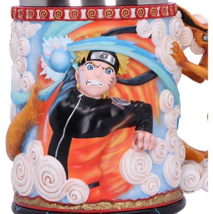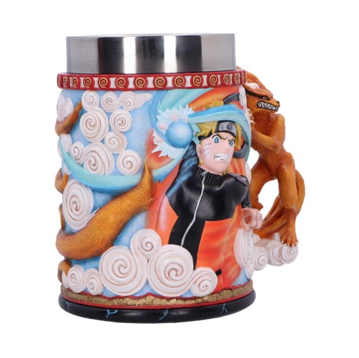 The product features a remarkable design that includes Naruto with a cloud and sky design wrapping around the tankard's background. Kurama is intricately sculpted as the handle, with the nine tails wrapping around the back. Additionally, it boasts an easy-to-clean removable stainless steel inner cup for convenience, while the outer structure is cast in high-quality resin and hand-painted with fine detail, ensuring a premium look and feel.