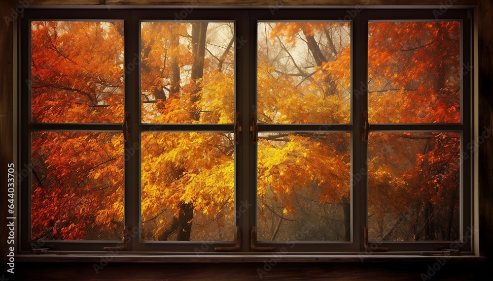 Photography Old window with autumn trees background