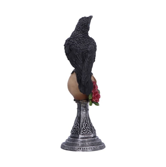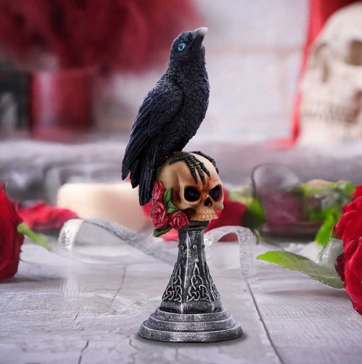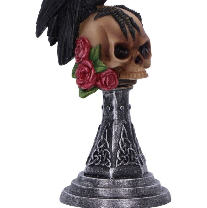 The skull itself is rich in detail, with natural bone texturing and deep-set eye sockets. On its right side, delicate roses add an eerie yet elegant touch, blending gothic beauty with a sense of foreboding. Beneath it, the base features intricate Celtic knot engravings, enhancing the spiritual and mystical appeal of the piece.