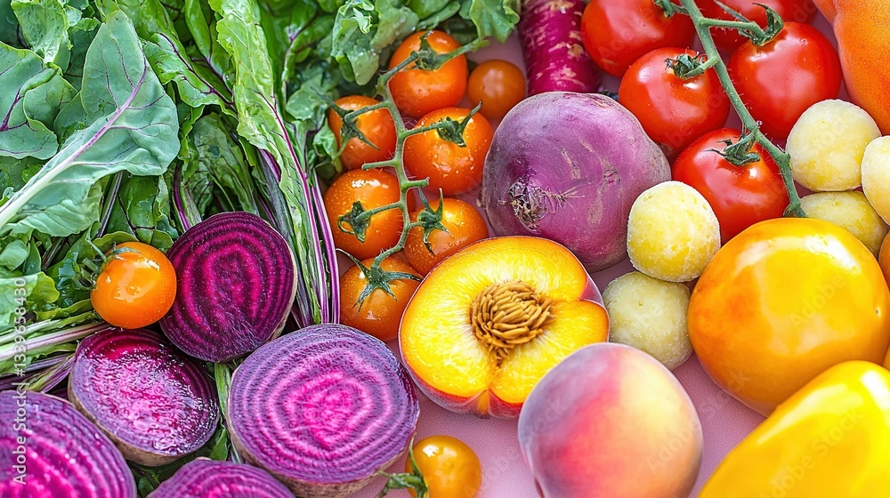 Photography Pink-clothed table adorned with diverse fruit and vegetable array