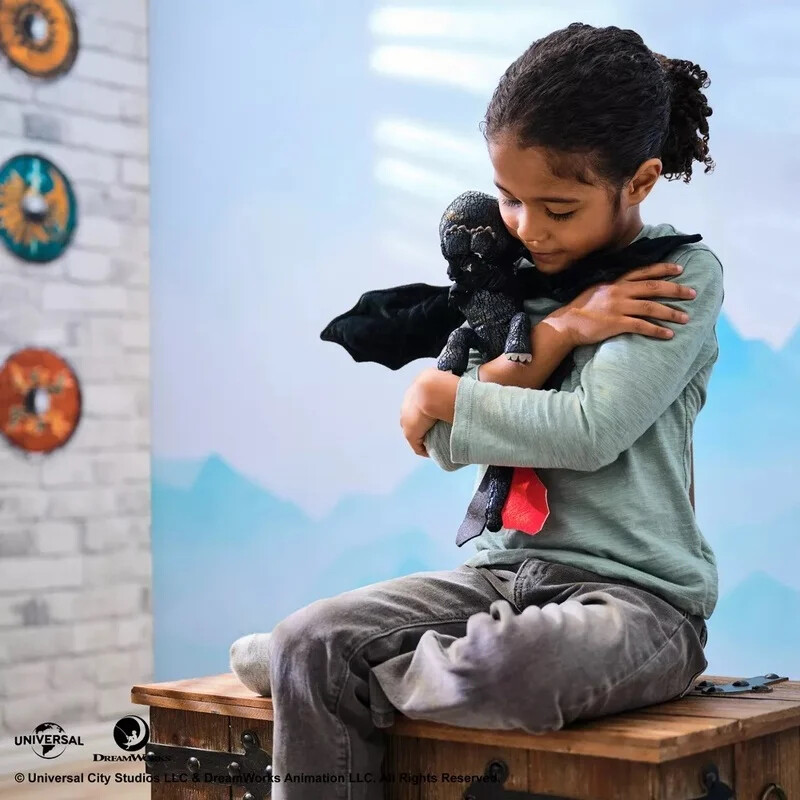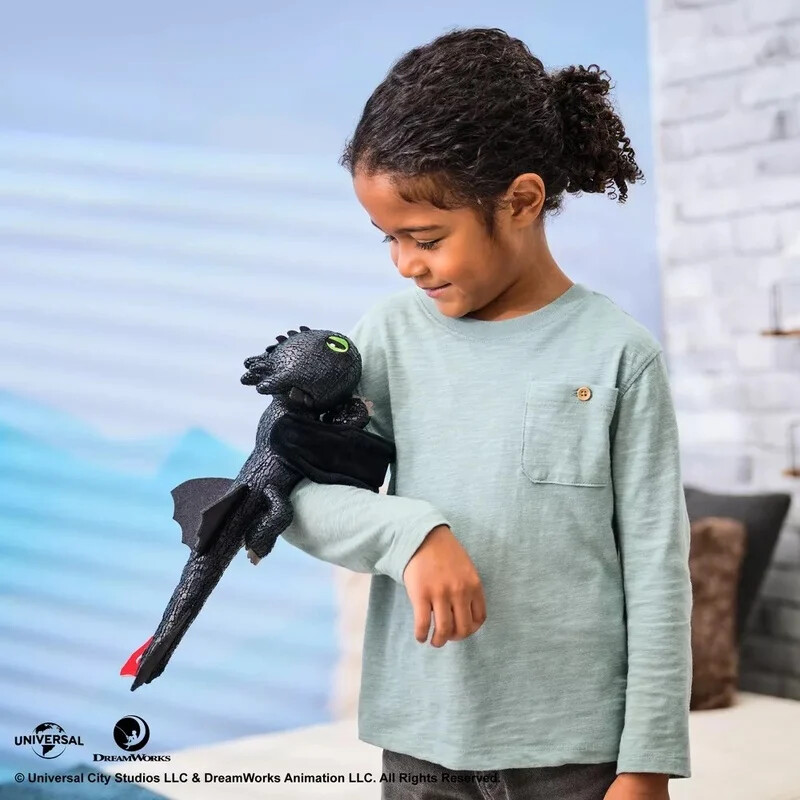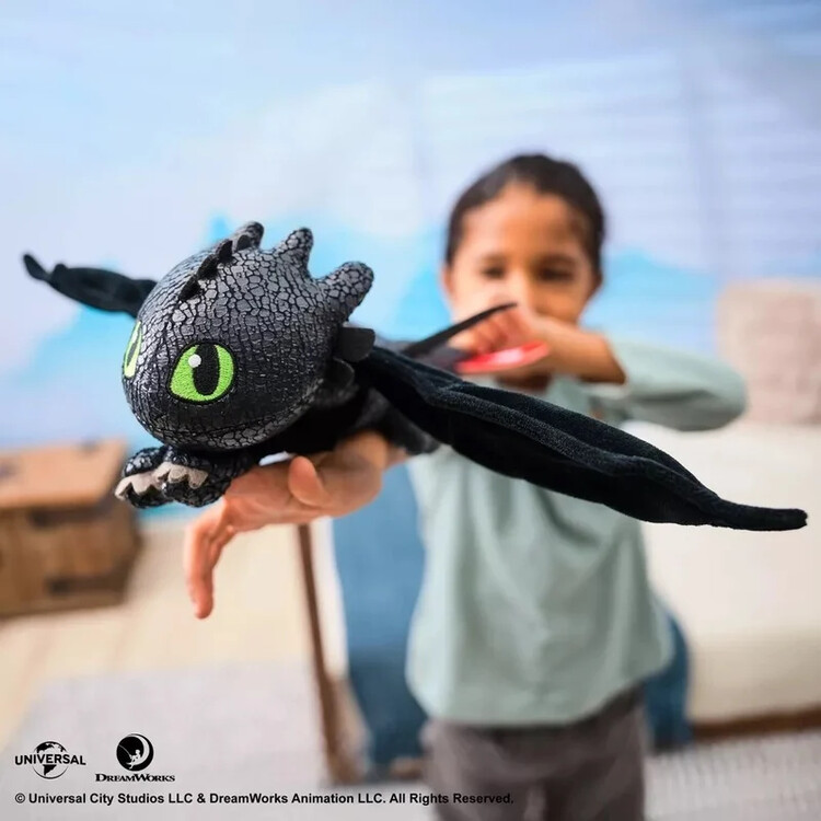 Take to the skies with Toothless! This plush dragon from How to Train Your Dragon features soft black fabric, embroidered green eyes, felt claws, and velvety wings. With a built-in strap, you can attach him to your arm for cuddles or heroic gliding poses. Slide your fingers through the elastic loops under his front paws, pull back, and release – he soars through the air just like in the movies! Great for kids aged 5+, this plush makes the perfect gift for birthdays, holidays, or everyday dragon adventures.