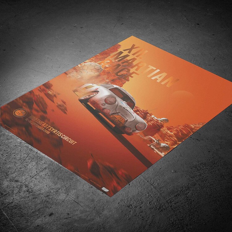 Transposing the sweltry conditions, red dust and general terrain of the 1953 Panamerican Race in Mexico is this poster, imagined to be held in the future on planet Mars. The 1953 Panamerica was more purgatory than pleasure for drivers who tackled the 3000-kilometre four-day race through some of the most inhospitable parts of Mexico. Someone at Porsche decided that a modern-day 356 SL could tackle a marathon event somewhere well known for its red dust – the planet Mars! Automobilist has brought this feverish imagination to life with this one set on the red planet in 2096. Visit the historic version.