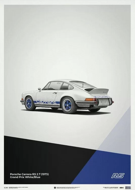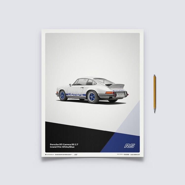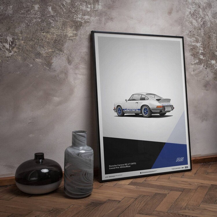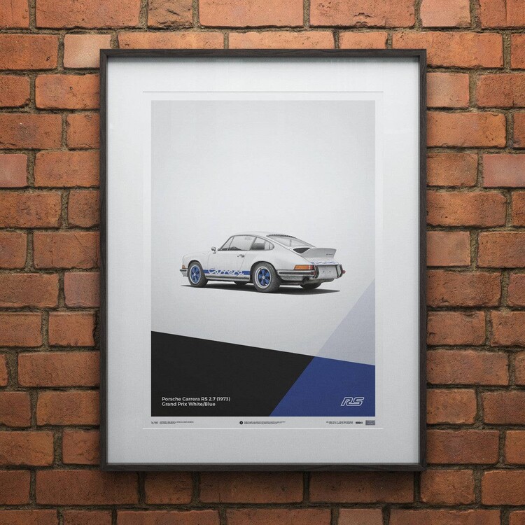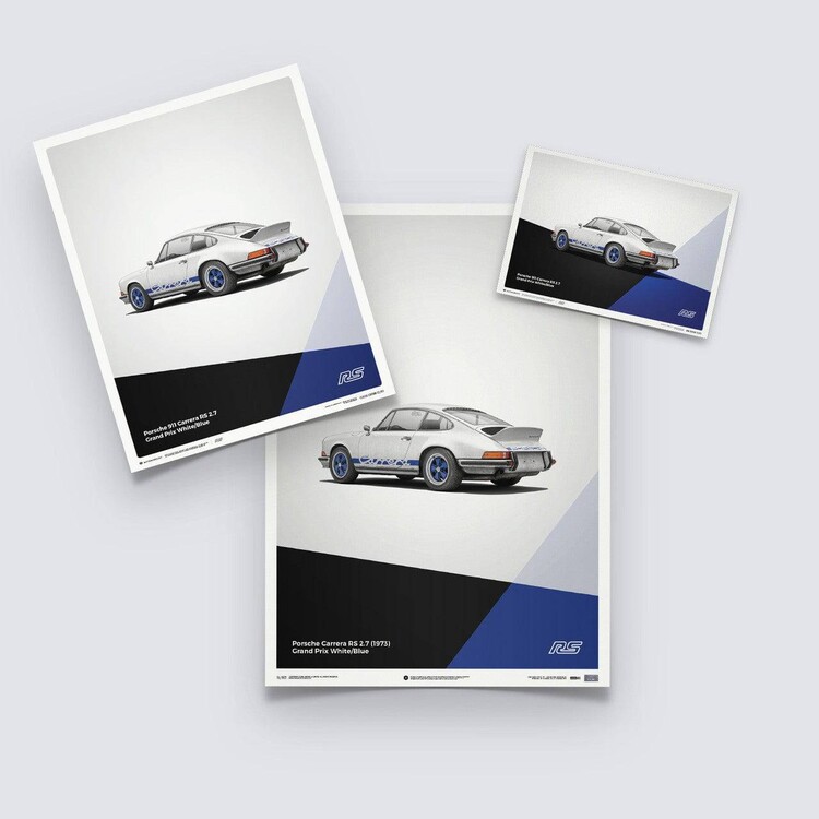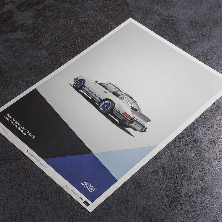 The white Porsche 911 Carrera RS poster features a car that many consider to be the most classic 911 ever built. Designed to meet motorsport requirements, the RS – meaning Rennsport, the German word for race sport – featured a larger engine than the standard 911 S, stiffened suspension, and an iconic ‘ducktail’ rear spoiler. In total, 1,580 were made between 1973 and 1974, all of which qualified for the FIA Group 4 class. Our posters have been created to complement the wide selection of iconic and eye-catching colors the cars were painted in – printed on perfectly weighted paper, as part of a production run of just 911 prints. For all of our posters we use high quality off-set printing, premium paper, and vibrant color reproduction that stands the test of time – just like the cars themselves. Each one is limited and labeled with a special hologram sticker to denote its authenticity.