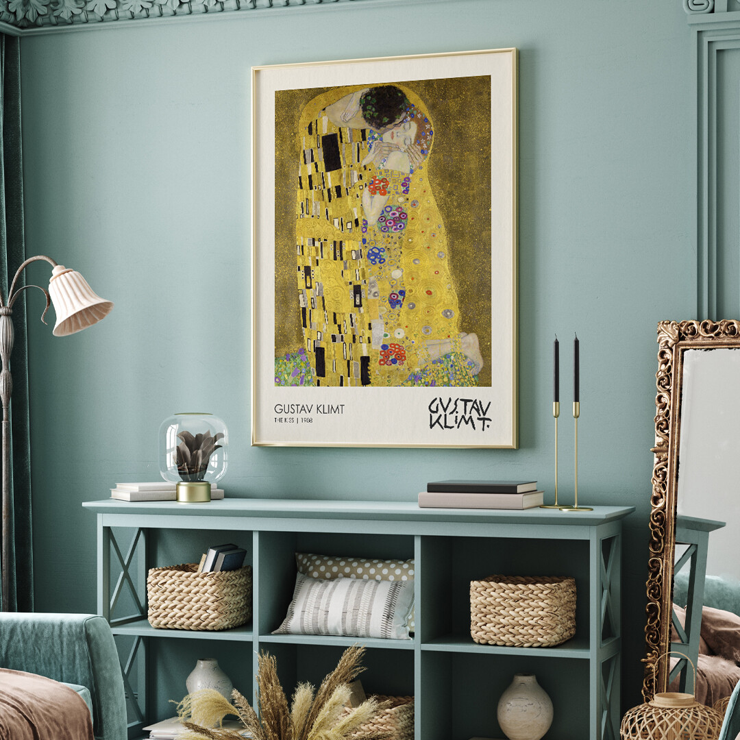 The Kiss is an oil painting with the addition of gold leaf, silver and platinum, painted in 1907-8, at the height of what is known as the 'Golden Age'. The robes of the entwined figures are decorated in a style influenced by contemporary Art Nouveau and the organic forms of the earlier Arts and Crafts movement. The painting now hangs in the Belvedere in Vienna and is considered a masterpiece of Viennese Art Nouveau. It is considered by many to be Klimt's most important artwork.