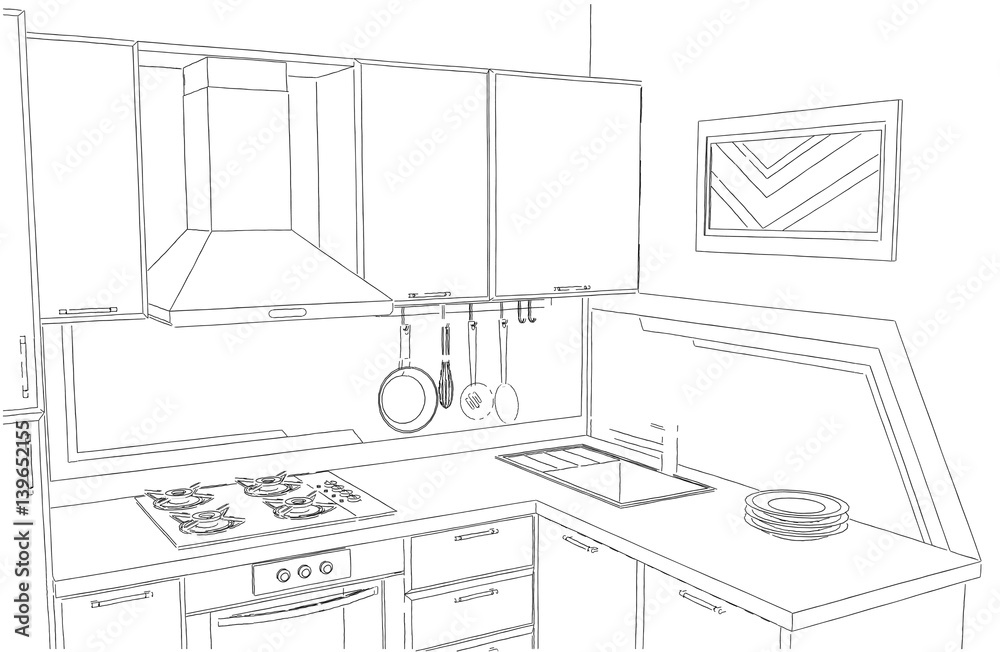 Photography Small corner kitchen interior freehand drawing.