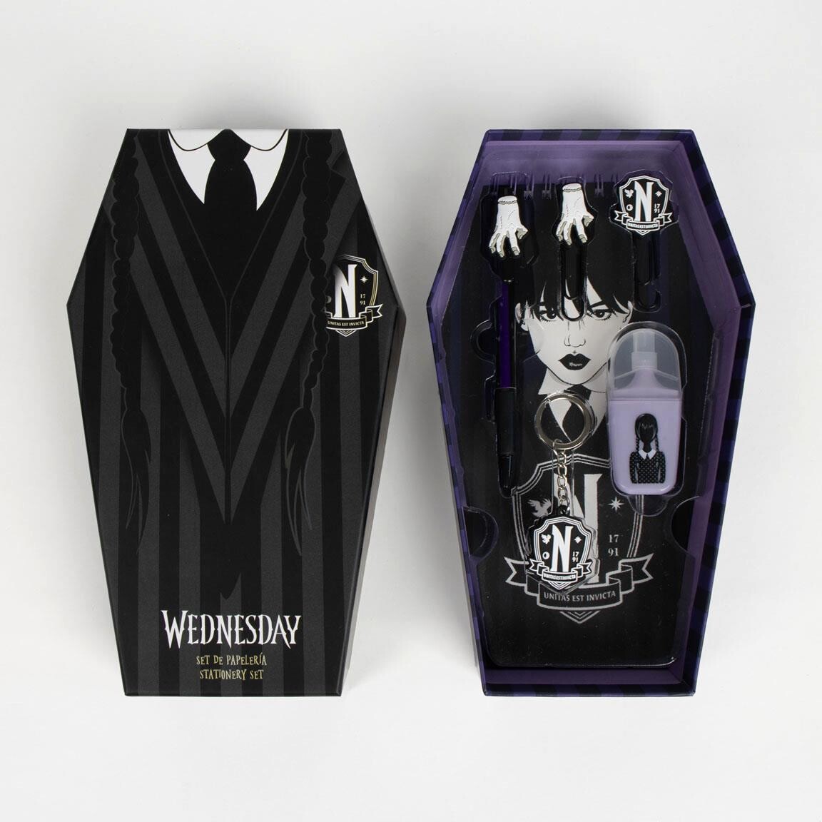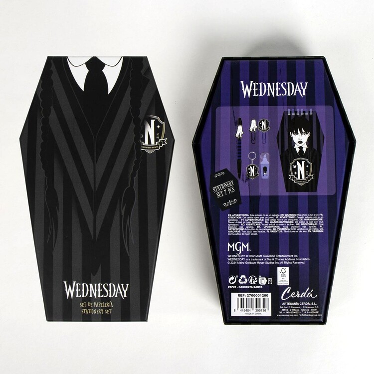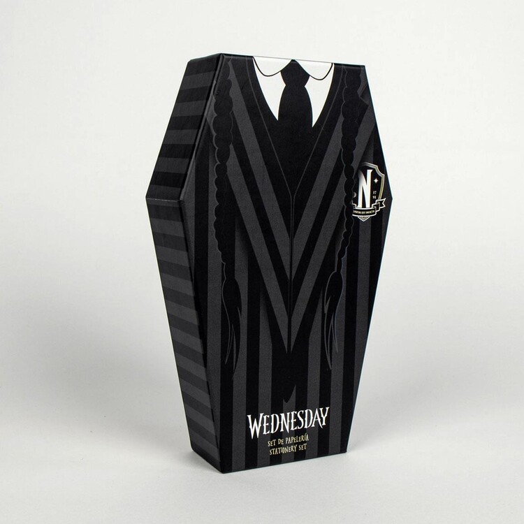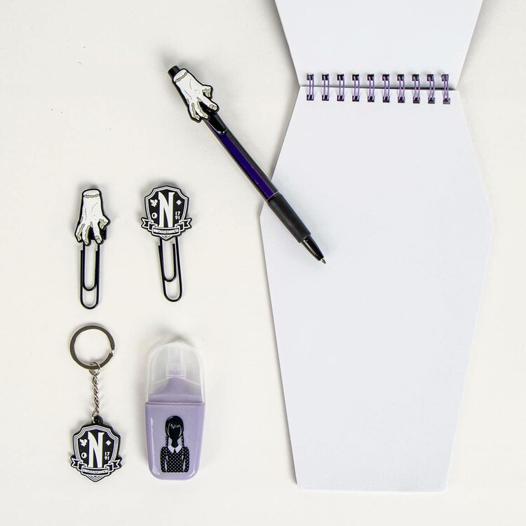 Stationery set inspired by the world of Wednesday – perfect for all fans of dark elegance. The set contains: notepad (15 × 25 cm), 2 clips with rubber detail, keychain, highlighter and pen.