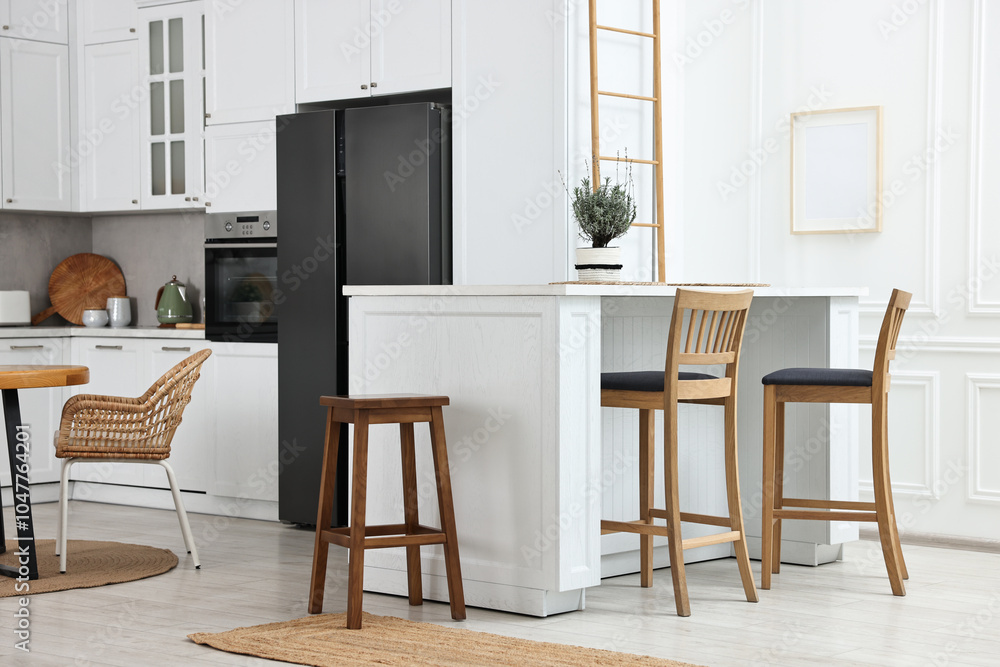 Photography Stylish kitchen with bar stools. Interior design