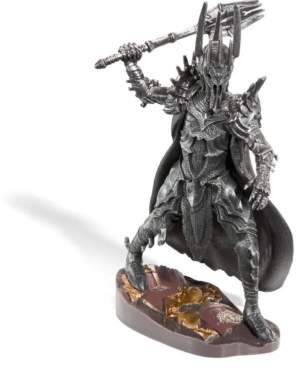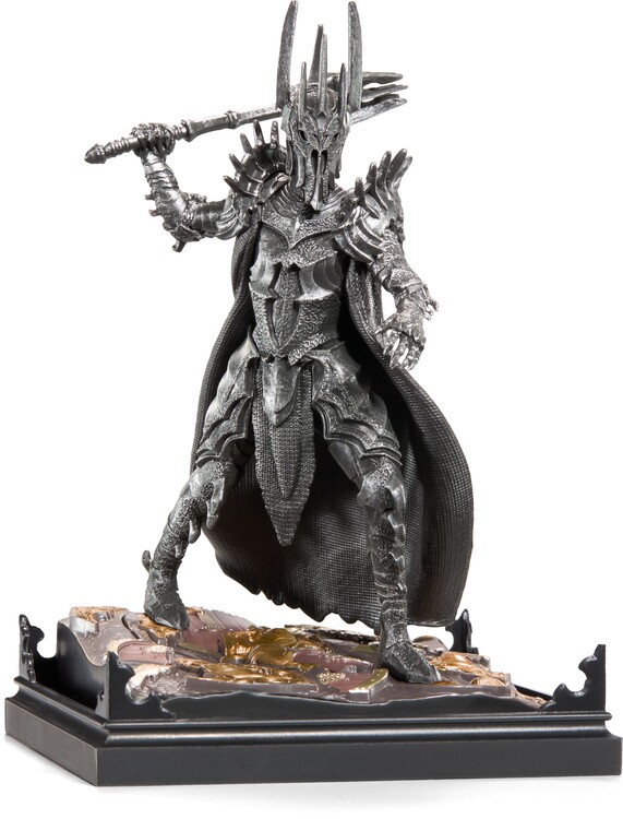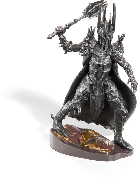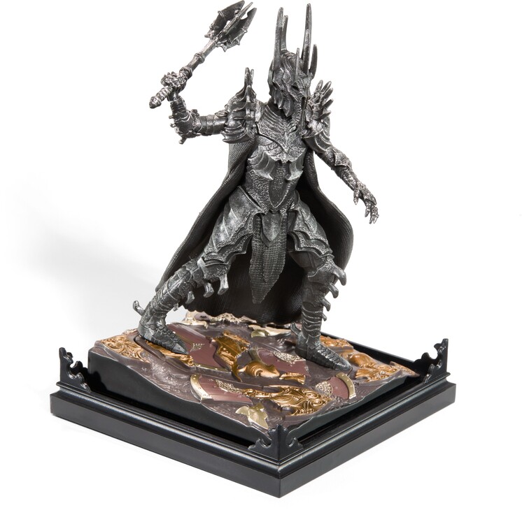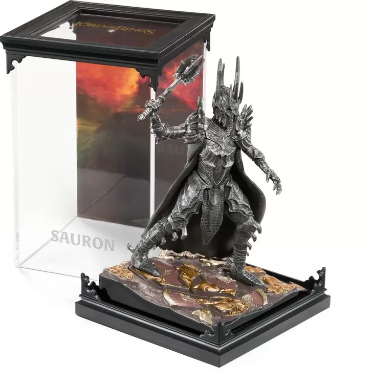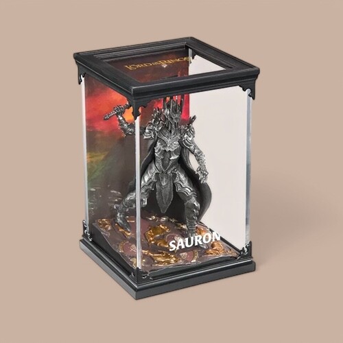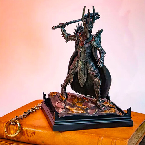 The meticulously crafted three-piece diorama of the Dark Lord Sauron from the world of Lord of the Rings is painted in detail and consists of a lid with scenery, a base and a removable figure. The dimensions of the diorama are 10 × 10 × 17 cm.