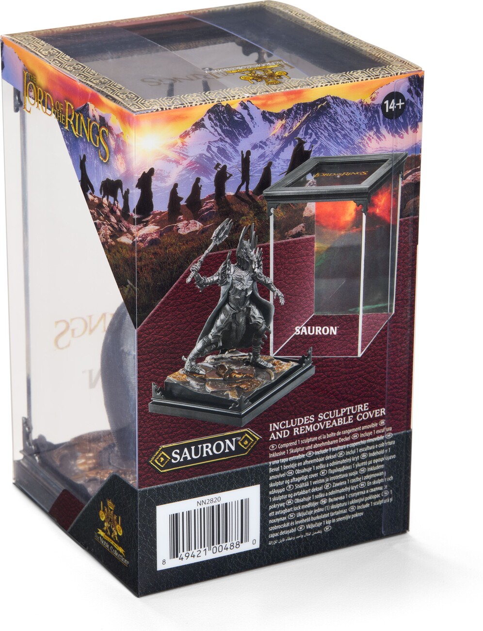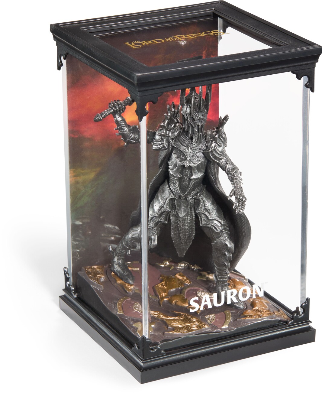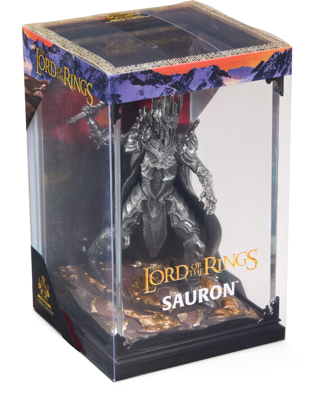 The meticulously crafted three-piece diorama of the Dark Lord Sauron from the world of Lord of the Rings is painted in detail and consists of a lid with scenery, a base and a removable figure. The dimensions of the diorama are 10 × 10 × 17 cm.