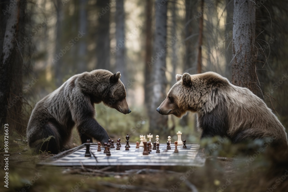 Photography Two bears play chess surrounded by forest. Generative AI.