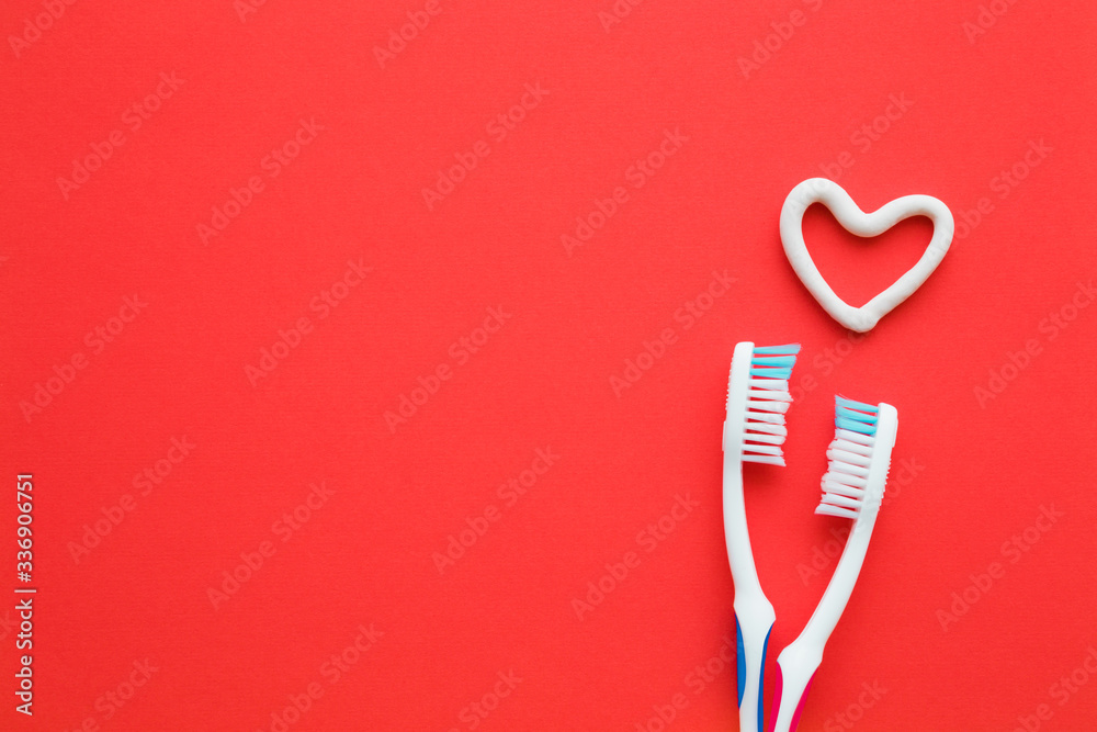 Photography Two white toothbrushes on bright red background