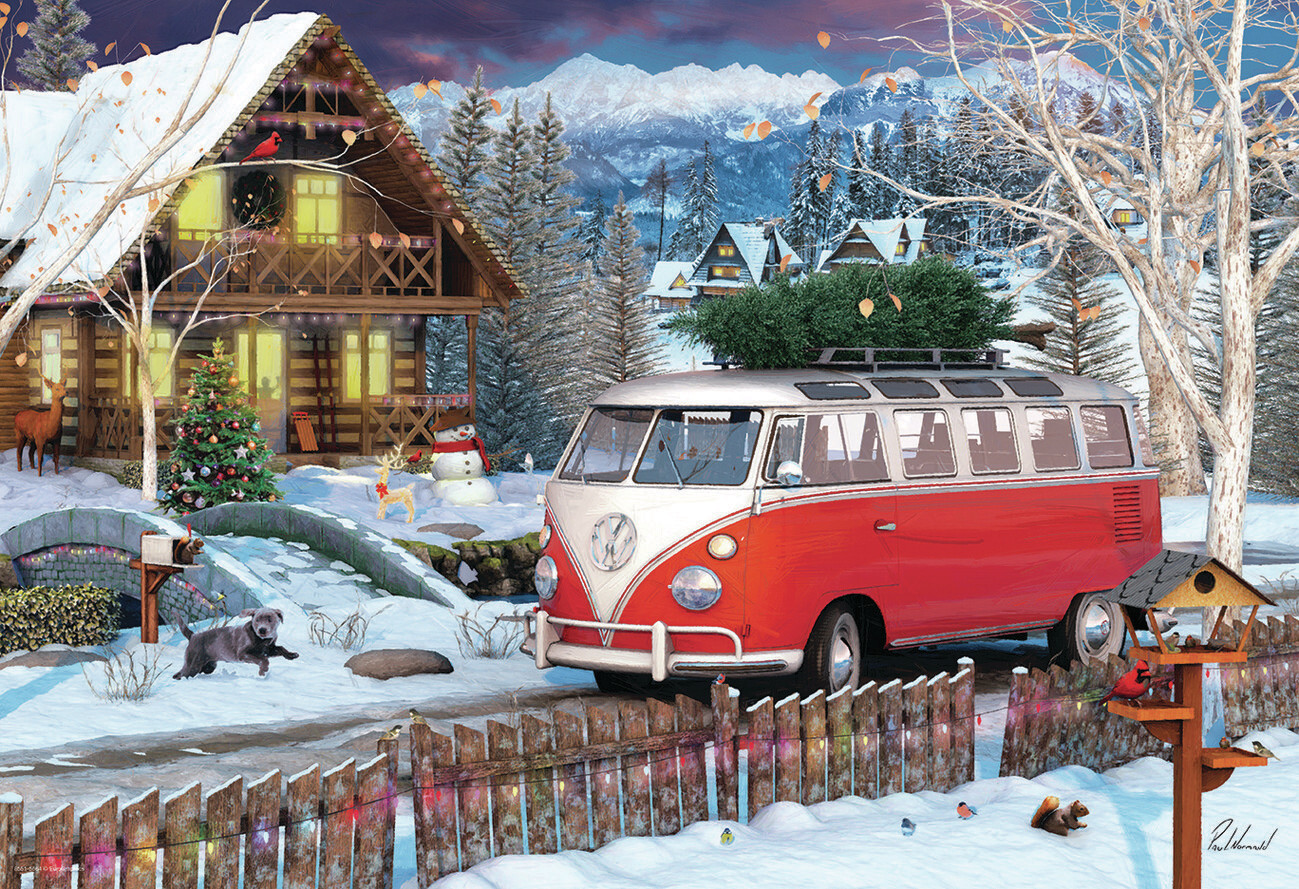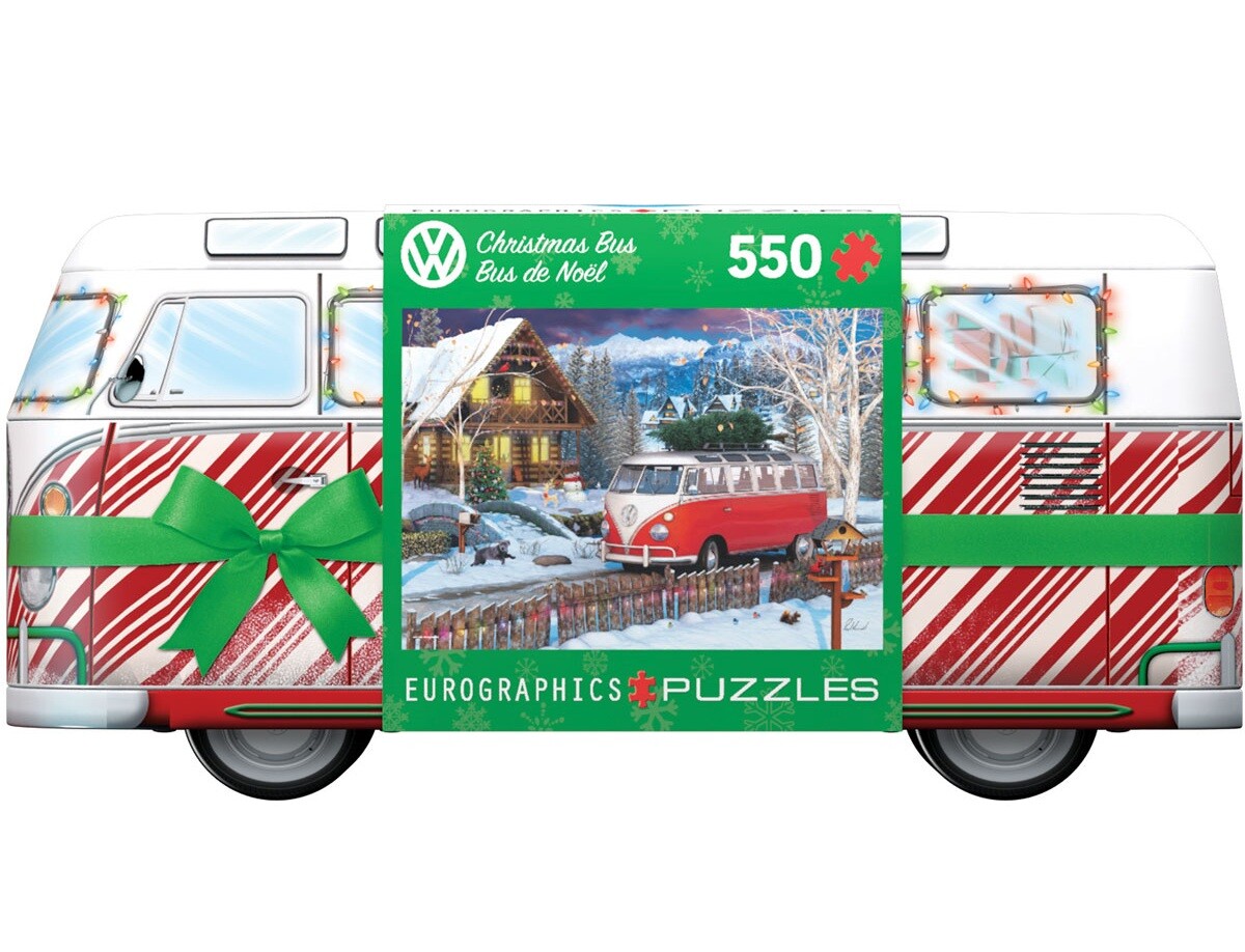 Iconic VW bus in a festive look as a 550-piece puzzle in an embossed tin. Precisely cut pieces fit together easily. Bonus included: a poster with the motif – use as a reference or as decoration. Officially licensed. Eco-friendly production from recycled and responsibly sourced materials. Recommended age: 12+.
