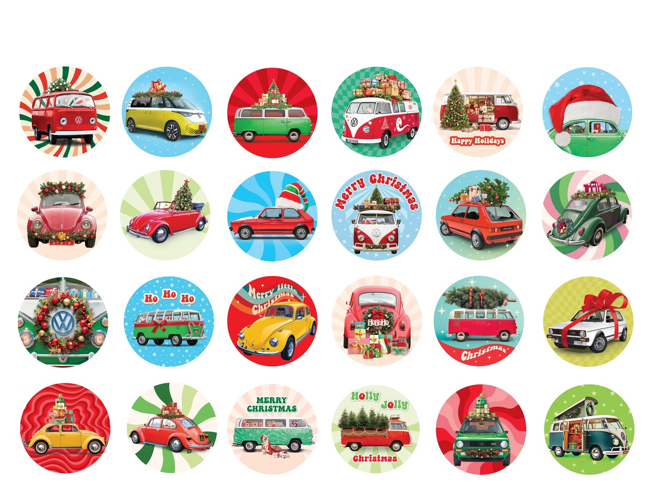 An Advent ritual for fans of retro cars. The calendar hides 24 circular mini puzzles featuring iconic VW vehicles. Each picture is made of 50 precisely cut pieces that interlock smoothly, making assembly almost effortless. Once completed, the puzzles can be used as Christmas ornaments—the set includes adhesive backings and ribbons. Officially licensed.